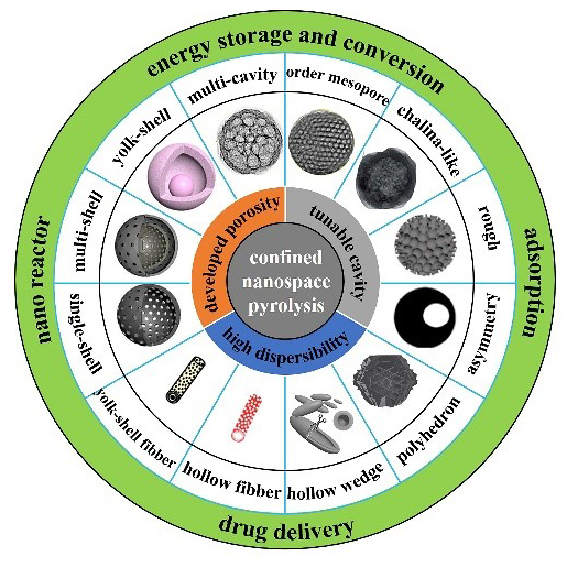 Confined nanospace pyrolysis (CNP) has attracted increasing attention as a general strategy to prepare task-specific hollow structured porous carbons (HSPCs) in the past decade. The unique advantages of the CNP strategy include its outstanding ability in control of the monodispersity, porosity and internal cavity of HSPCs. As a consequence, the obtained HSPCs perform exceptionally well in applications where a high dispersibility and tailored cavity are particularly required, such as drug delivery, energy storage, catalysis and so on. In this review, the fundamentals of the CNP strategy and its advances in structural alternation is first summarized, then typical applications are discussed by exemplifying specific synthesis examples. In addition, this review offers insights into future developments for advanced task-specific hollow structured porous materials prepared by the CNP strategy.