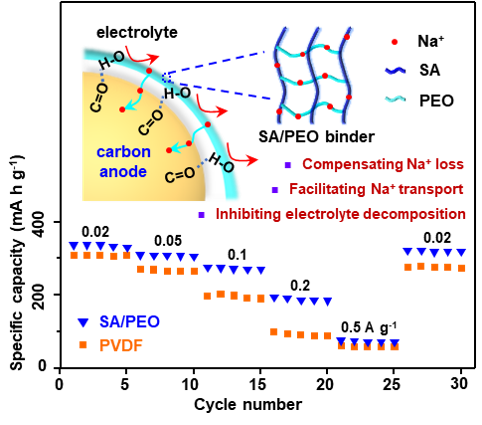 Hard carbon (HC) has emerged as a promising anode material for sodium-ion batteries (SIBs), whereas it suffers from low initial Coulombic efficiency (ICE) and poor rate capability. Binders endowed with high electron/ion transport and strong mechanical integrity are expected to boost the practical application of HC anodes, which cannot be realized via the functional design of commercially available binders. Herein, a trifunctional sodium alginate (SA)/polyethylene oxide (PEO) binder with massive hydrophilic functional groups and abundant Na+ is synthesized via a feasible esterification reaction. The binder forms a passivation film on glucose-derived carbon (GC) to suppress the electrolyte decomposition and offer stronger adhesion strength. Furthermore, the sluggish Na+conduction is improved via sufficient ionic transfer channels provided by PEO. Notably, effects of Na+ compensation and interfacial ionic transport of Na+-containing binder for HC anodes are revealed. Therefore, the SA/PEO binder for the GC anode delivers a high ICE up to 87% and a high capacity of 270 mA h g-1 at 0.1 A g-1, both 10% and 90 mA h g-1 higher than that of PVDF binder, respectively. Significantly, this SA/PEO binder can also be applied to coal-based and polymer-based carbon anodes, exhibiting universal applicability.