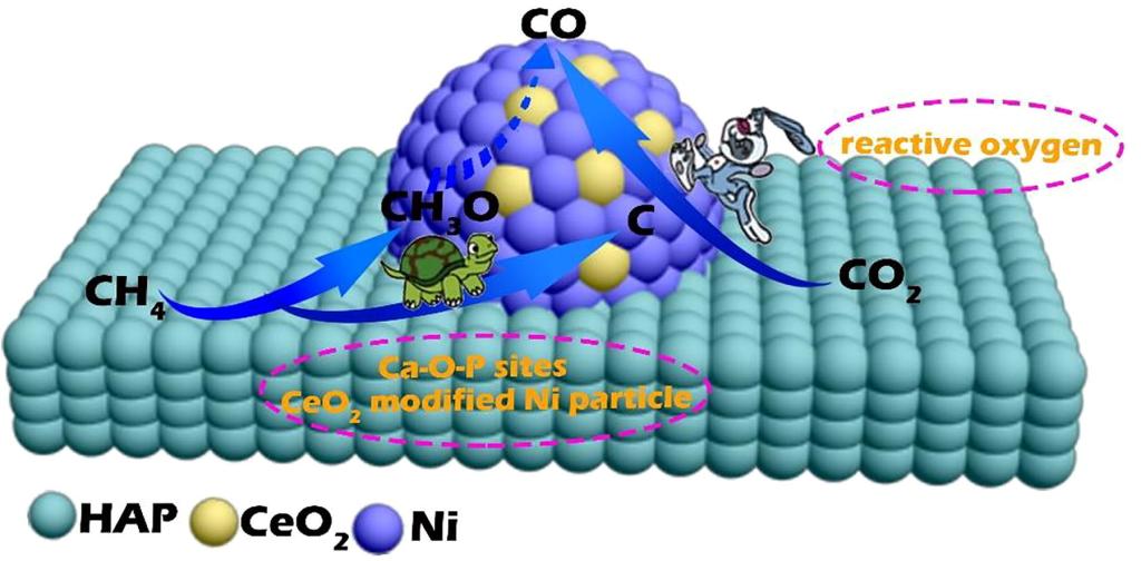 Methane dry reforming (MDR) is a promising process to convert two major greenhouse gases into syngas. However, the major drawback of the process is the deactivation of Ni-based catalysts due to carbon deposition and metal sintering. Herein, we prepared hydroxyapatite (HAP) supported Ni catalysts modified by CeO2, which can efficiently promote MDR reaction with the excellent anti-coking property. The strong interaction between Ni and HAP guarantees the stability of highly dispersed Ni particles during the MDR reaction. The neighboring CeO2 over Ni particles could facilitate the mobility of oxygen, which assists the activation of CH4 to CH3O and in some extent hinders the deep cracking of CH4 into deposited carbon. Meanwhile, the kinetic studies indicate that the existence of reactive oxygen species is beneficial for enhancing carbon gasification. Accordingly, the addition of CeO2 balanced the carbon formation and gasification over Ni and therefore efficiently prevented coke accumulation. The exploration of NiCex/HAP catalysts would provide inspiration for future MDR catalyst design.
