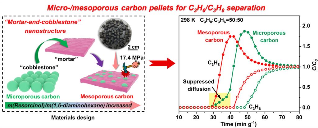 “‘Mortar-and-cobblestone’ type carbon pellets with interlinked C3H6-philic domains and mesoporous transport channels for propylene/propane separation”