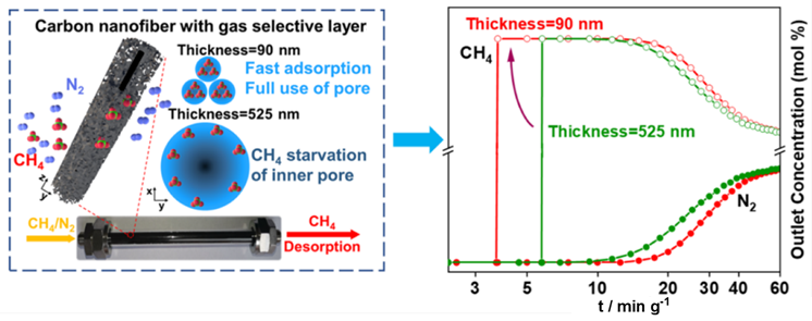 The adsorption separation and purification of coalbed methane (CH4) has attracted global interest as an important technique for the utilization of unconventional natural gas. The success for this method relies on the development of adsorbent materials that can selectively enrich CH4. Toward this goal, we report a facile in-situ growth method to prepare carbon nanofibers with ultramicroporous gas selective layer as adsorbent for CH4/N2 separation. The thickness of gas selective layer can be precisely tuned from 90 nm to 525 nm. The optimal carbon nanofibers exhibited a high CH4/N2 selectivity of 6.8 with the CH4 uptake reaching 0.97 mmol g-1 as well as two orders of magnitude faster CH4 diffusion kinetics than the commercial activated carbon adsorbent. The high accessibility to the adsorption sites and short diffusion path of the nanofibers facilitate the rapid mass transfer and intensify the dynamic CH4/N2 separation. Pressure swing adsorption simulations indicated the recovery and productivity over the carbon nanofibers with 90 nm-thick gas selective layer increased by 40 % and 20 %, respectively, as compared to the 525 nm-thick counterparts. This work offers a new insight for designing high-performance CH4/N2 adsorbents through suitable combination between rich ultramicropores and short diffusion path.